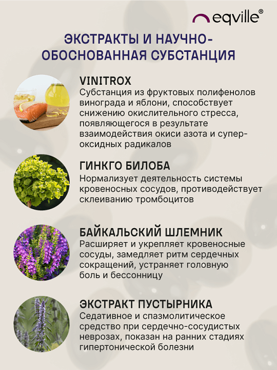 Использование в препарате запатентованной научно-обоснованной субстанции Vinitrox, обеспечивает расширение сосудов и увеличение циркуляции крови в организме. Благодаря специально подобранному соотношению полифенолов винограда и яблока является эффективным антиоксидантом и защищает организм от действия свободных радикалов, снижает риск развития сердечно-сосудистых заболеваний. Усиливает питание сердечной мышцы кислородом, предупреждая кислородную недостаточность
