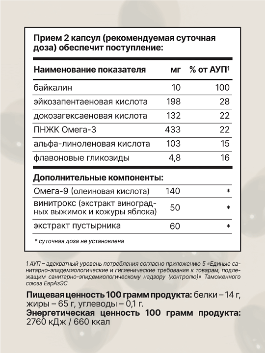 ПНЖК, ЭПК 198 мг, ДГК 132 мг в 2 капсулах. Омега-3 способствует снижению артериального давления, уменьшая риск тромбообразовании.