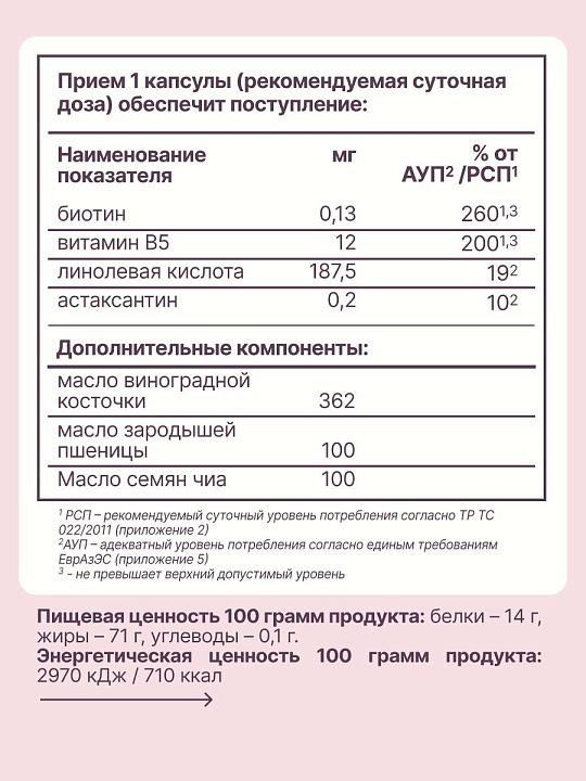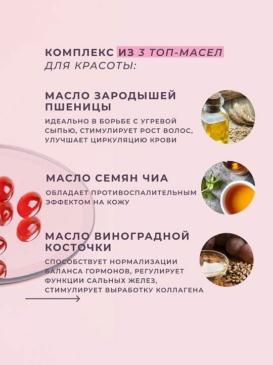 Масло виноградной косточки, обладает anti-age свойством, содержит ресвератрол — природный антиоксидант, стимулирующий регенерацию на клеточном уровне. Компоненты комплекса правильно сбалансированы, для обеспечения синергетического взаимодействия.