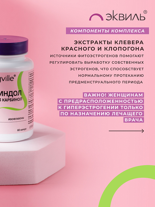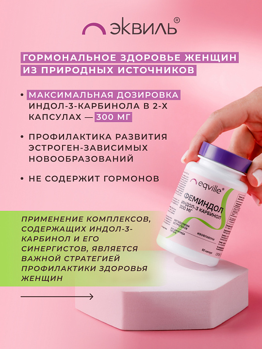 Сочетание 3-индол карбинола с активными веществами выделенными из экстрактов, способствуют снижению проявлений гормональных нарушений, таких как развитие эстроген-зависимых новообразований, ПМС, фиброзно-кистозная мастопатия, эндометриоз, симптомы связанные с климаксом.В комплексе максимальная доза 3-индол карбинола в 2-х капсулах 300 мг - природное вещество выделенное из крестоцветных.
