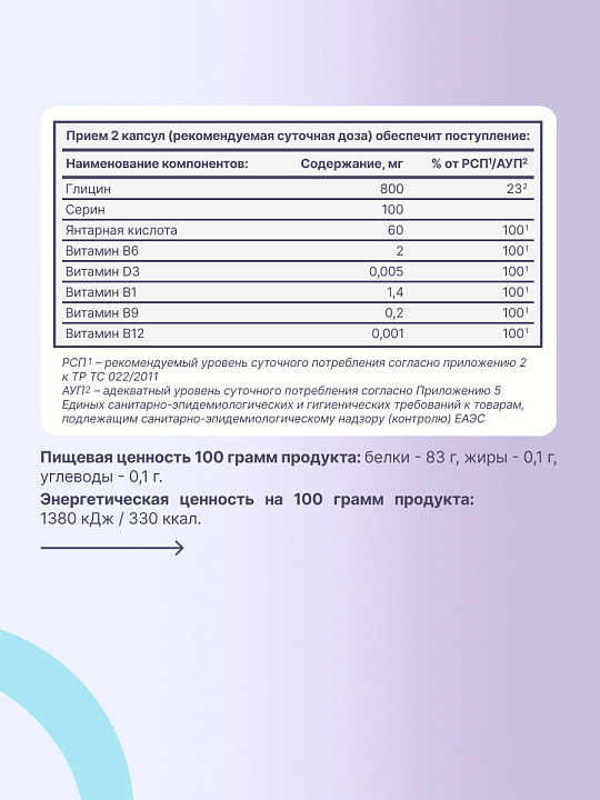 Глицин заменимая аминокислота нейромедиатор, которая регулирует обменные процессы в центральной нервной системе, помогает снизить уровень стресса и тревоги, улучшает качество сна и общую психологическую устойчивость, повышает концентрацию внимания и улучшает память.Комплекс работает в синергии с серином - аминокислотой нейромедиатором, которая принимает участие в биосинтезе ряда других заменимых аминокислот: глицина, цистеина, метионина, триптофана, отвечающих за выработку серотонина - гормона хорошего настроения.