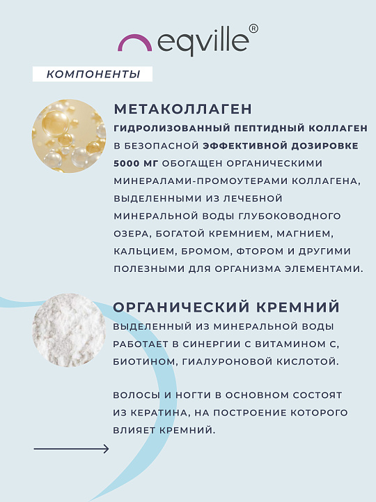 Метаколлаген – низкомолекулярный, гидролизованный коллаген I и III типов, содержит семь из восьми незаменимых аминокислот: лейцин, изолейцин, валин, лизин, метионин, треонин и фенилаланин. Олиго- и полипептиды низкой молекулярной массы способствуют эффективному синтезу собственного коллагена и регенеративным процессам.