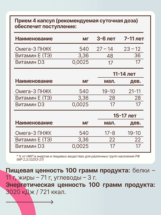 | Омега-3 ПНЖК (ЭПК / ДГК) | 540 | 27–38 | 23–29 | 19-24 | 21-26 | 8-17 | 10-19 |