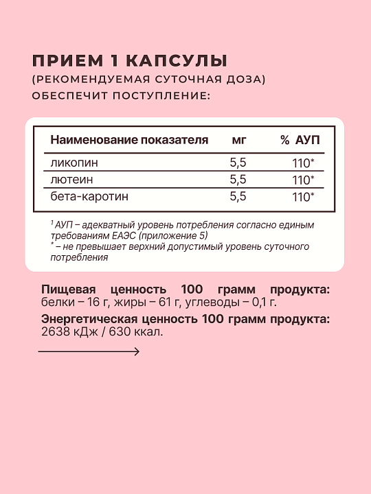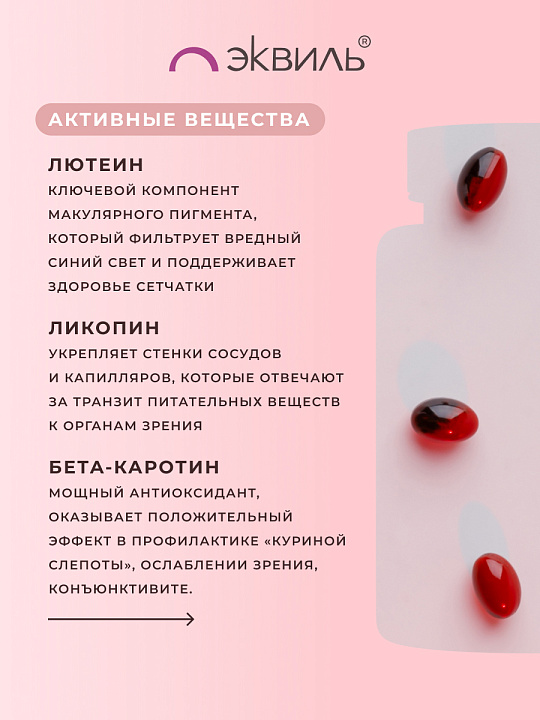 Ликопин — укрепляет стенки сосудов и капилляров, благотворно воздействует на кожу и слизистые оболочки, в том числе органов зрения. Ликопин защищает сетчатку от индуцированных светом повреждений и возрастной дегенерации макулы. Это вещество способствует укреплению стенок сосудов и капилляров, которые отвечают за транзит питательных веществ к органам зрения.