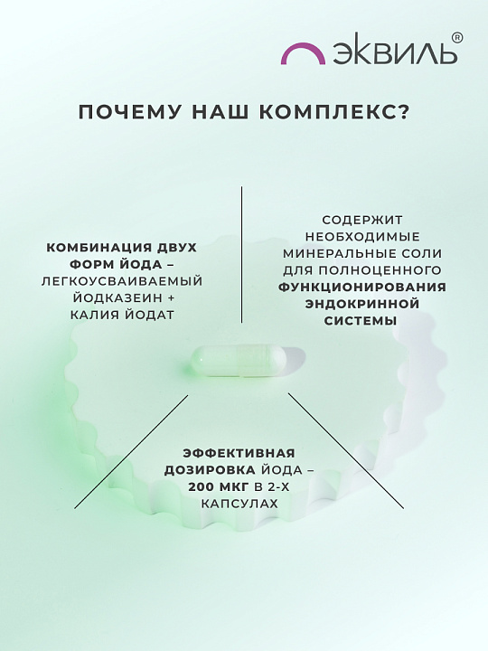 В комплексе комбинация калия йодат + органический йодказеин отвечает за улучшение внимания и памяти, формировании иммунитета, поддержание здоровья щитовидной железы и синтеза гормонов. Показан при гипотиреозе.