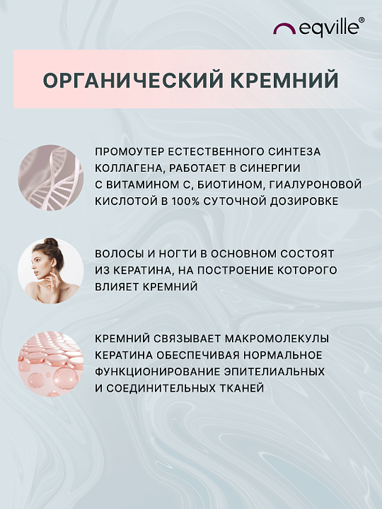 Снижение синтеза коллагена и гиалуроновой кислоты после 25 лет приводит к потере влаги и эластичности кожи и соединительной ткани. Волосы и ногти в основном состоят из кератина, на построение которого влияет кремний. Кремний связывает макромолекулы кератина обеспечивая нормальное функционирование эпителиальных и соединительных тканей.Кремний участвует в белковом и углеводном обмене, улучшая усвоение организмом более 70% химических элементов. Принимает участие в процессе минерализации костной ткани, что особенно важно для женщин в период климакса и менопаузы для снижения риска развития остеопороза.