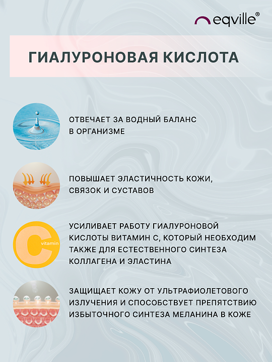 Гиалуроновая кислота в комплексе отвечает за водный баланс в организме, участвует в клеточных процессах, повышает эластичность кожи, связок и суставов.