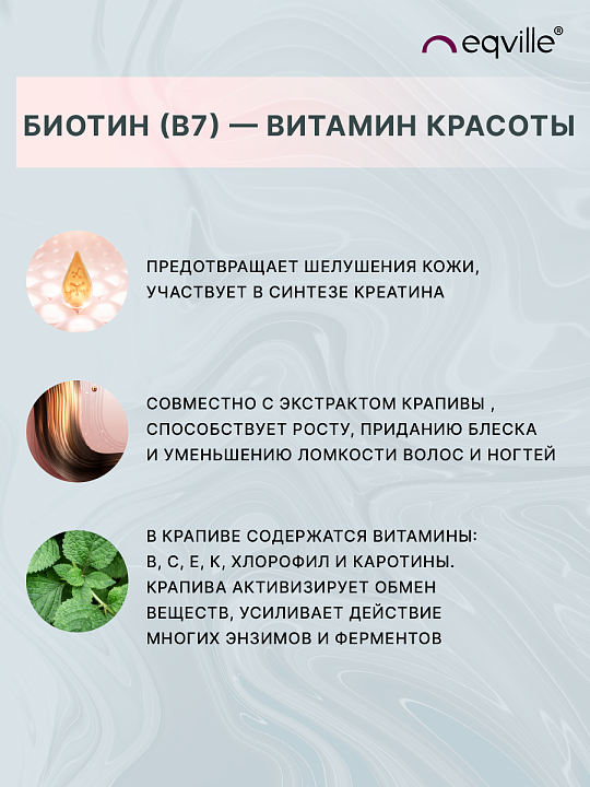 Биотин (витамин B7) витамин красоты предотвращает шелушения кожи, участвует в синтезе креатина. Совместно с экстрактом крапивы, способствует росту, приданию блеска и уменьшению ломкости волос и ногтей. В крапиве содержатся витамины В, С, Е, К, хлорофил и каротины. Крапива активизирует обмен веществ, усиливает действие многих энзимов и ферментов.