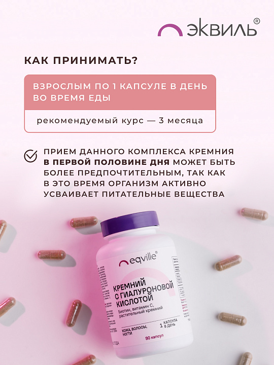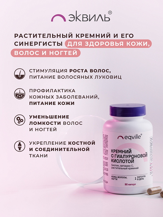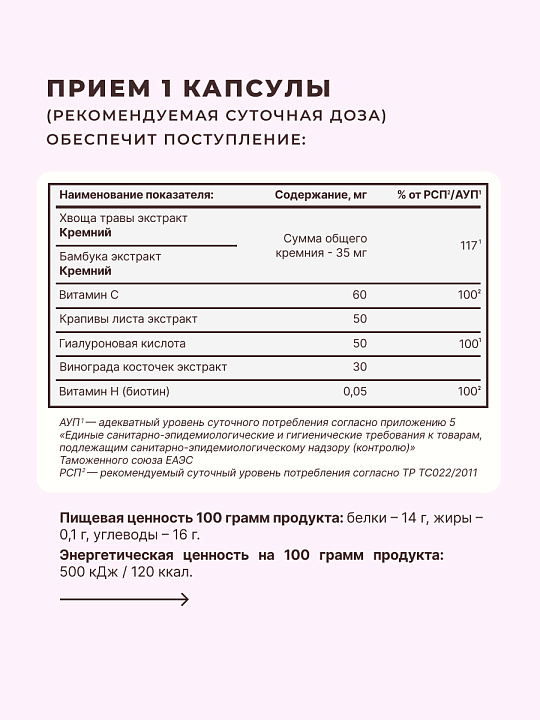 В комплексе органическая форма кремния, выделенная из экстракта хвоща и бамбука в 100% дозировке в 1 капсуле.