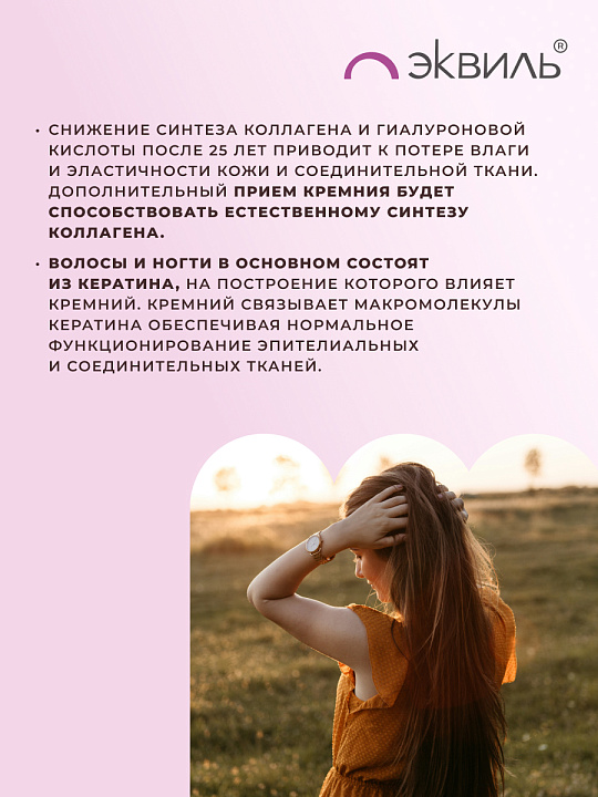 Снижение синтеза коллагена и гиалуроновой кислоты после 25 лет приводит к потере влаги и эластичности кожи и соединительной ткани. Волосы и ногти в основном состоят из кератина, на построение которого влияет кремний. Кремний связывает макромолекулы кератина обеспечивая нормальное функционирование эпителиальных и соединительных тканей.Кремний участвует в белковом и углеводном обмене, улучшая усвоение организмом более 70% химических элементов. Принимает участие в процессе минерализации костной ткани, что особенно важно для женщин в период климакса и менопаузы для снижения риска развития остеопороза.