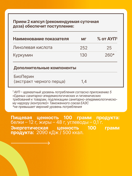 В комплексе куркумина 260% от рекомендуемого уровня суточного потребления, что является наиболее оптимальной дозировкой для курсового приема.