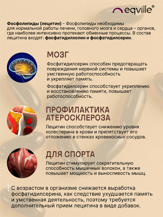 Содержащийся в лецитине фосфатидилсерин создает оптимальные условия для жизнедеятельности нейронов, необходим для укрепления когнитивного здоровья, улучшает работу мозга. Осуществляет транспорт питательных веществ в клетку, стимулирует обменные процессы. Фосфатидилсерин улучшает работоспособность, стимулирует выработку серотонина, снимает стресс и внутреннее напряжение, нормализует биоритмы.
