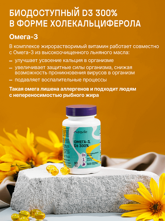 В комплексе жирорастворимый витамин работает совместно с Омега-3 из высокоочищенного льняного масла и улучшает усвоение кальция в организме, увеличивает защитные силы организма, снижая возможность проникновения вирусов в организм подавляя воспалительные процессы. Такая омега лишена аллергенов и подходит людям с непереносимостью рыбного жира.