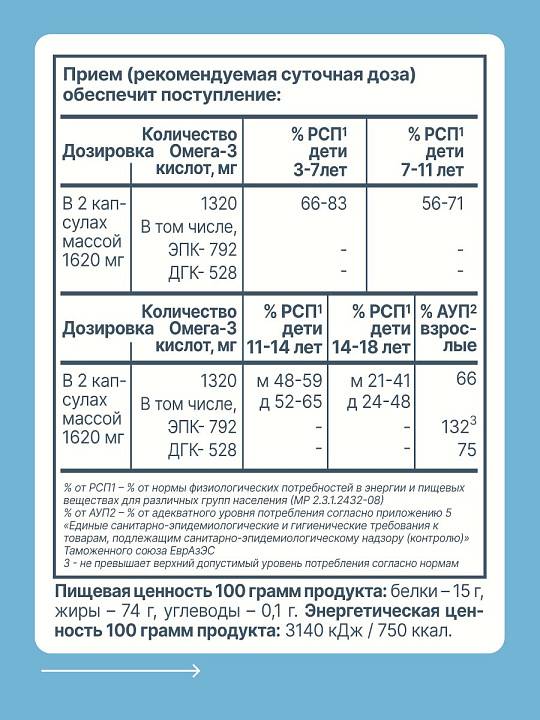ПНЖК Омега–3 относятся к эссенциальным (незаменимым) жирным кислотам. Они не синтезируются в организме человека, поэтому крайне важно ежедневно получать их в достаточном количестве с пищей. Основные представители ПНЖК омега-3 - эйкозапентаеновая кислота (ЭПК/EPA) и докозагексаеновая кислота (ДГК/DHA). Главная роль ЭПК в организме – синтез т.н. эйказаноидов – молекул-сигнализаторов, играющих важную физиологическую роль в нашем организме. Эйказаноиды, произведённые из Омега-3, снижают уровень воспаления, улучшает реологические свойства крови. ДГК - важный структурный компонент кожи и радужной оболочки глаз. ДГК играет жизненно важную роль как при развитии мозга у детей, так и при функционировании мозга у взрослых. Нехватка ДГК в ранний период жизни ассоциируется с проблемами в более позднем возрасте, в т.ч. трудностями в учёбе, синдромом дефицита внимания и гиперактивности, агрессивным поведением и другими расстройствами ПНЖК омега-3 участвуют в обеспечении функционирования клеточных мембран, влияют на их текучесть.