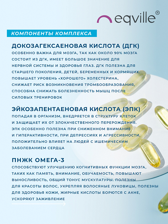 ПНЖК Омега–3 относятся к эссенциальным (незаменимым) жирным кислотам. Они не синтезируются в организме человека, поэтому крайне важно ежедневно получать их в достаточном количестве с пищей. Основные представители ПНЖК омега-3 - эйкозапентаеновая кислота (ЭПК/EPA) и докозагексаеновая кислота (ДГК/DHA). Главная роль ЭПК в организме – синтез т.н. эйказаноидов – молекул-сигнализаторов, играющих важную физиологическую роль в нашем организме. Эйказаноиды, произведённые из Омега-3, снижают уровень воспаления, улучшает реологические свойства крови. ДГК - важный структурный компонент кожи и радужной оболочки глаз. ДГК играет жизненно важную роль как при развитии мозга у детей, так и при функционировании мозга у взрослых. Нехватка ДГК в ранний период жизни ассоциируется с проблемами в более позднем возрасте, в т.ч. трудностями в учёбе, синдромом дефицита внимания и гиперактивности, агрессивным поведением и другими расстройствами ПНЖК омега-3 участвуют в обеспечении функционирования клеточных мембран, влияют на их текучесть.