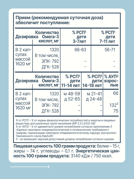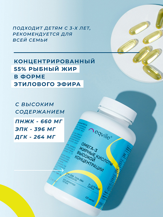 • Короткий жизненные цикл мелких пород рыб позволяет меньше накапливать канцерогенных веществ, что обеспечивает более чистый, безопасный и биодоступный конечный продукт.• Наш обычный рацион неспособен обеспечить поступление полиненасыщенных жирных кислот должном объеме. Поэтому важно компенсировать недостатки питания приемом Омега-3 жирные кислоты для всей семьи и детей с 3ех лет. 55% концентрат (Fish oil) жира в форме этилового эфира с высоким содержанием ПНЖК - 660 мг, ЭПК - 396 мг, ДГК – 264 мг в 1 капсуле массой 1620 мг. ДГК И ЭПК — наиболее важные типы Омега-3, именно они входят в состав комплекса.
