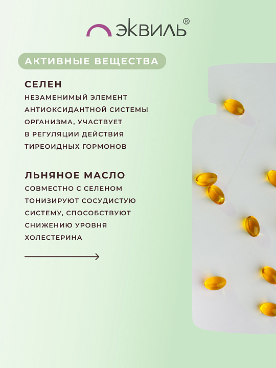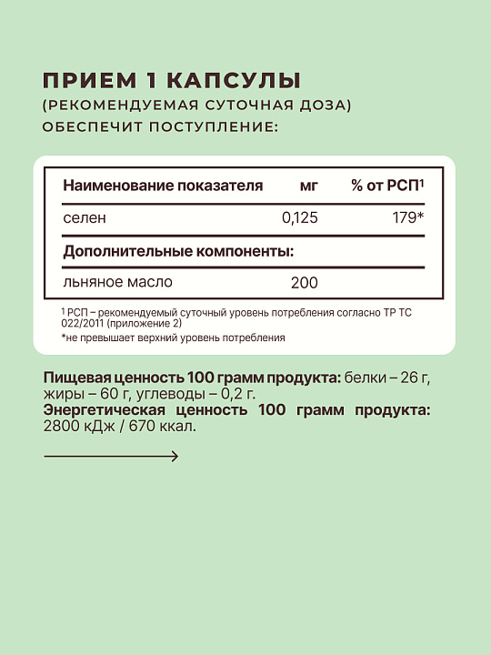 В комплексе жирорастворимый селексен работает совместно с Омега-3 из высокоочищенного льняного масла, источника альфа-линоленовой кислоты. Льняное масло совместно с селеном тонизируют сосудистую систему, способствуют снижению уровня холестерина.
