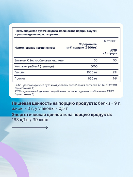 Рыбный коллаген – низкомолекулярный коллаген I типа с высоким содержанием аминокислот глицина и пролина; близок по аминокислотному составу с коллагеном человека, что позволяет ему усваиваться в 100% - 1 порция рыбного коллагена заменяет 2-4 порции коллагена других типов.