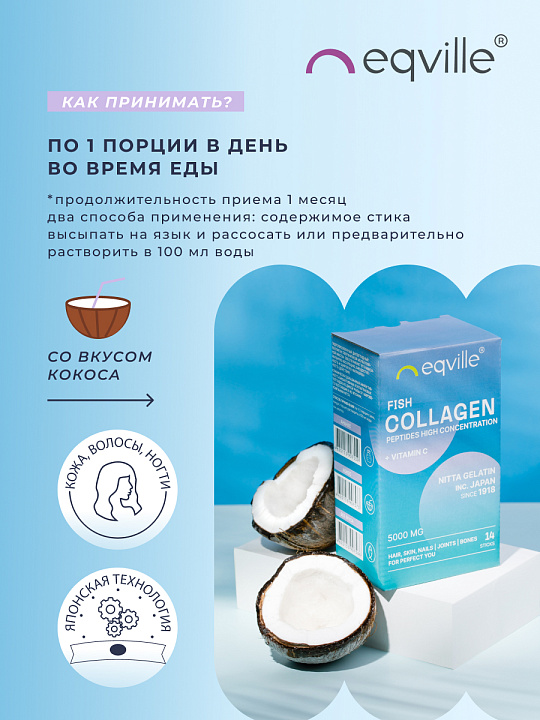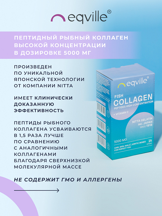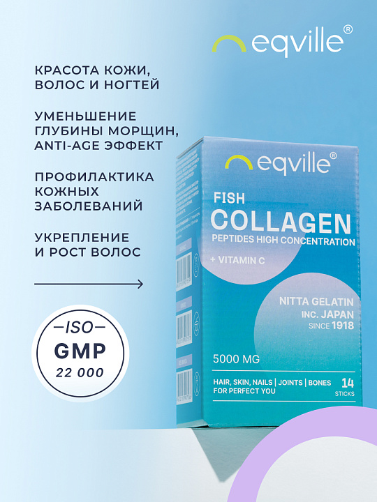 Пептидный рыбный коллаген высокой концентрации в дозировке 5000 мг, произведенный по японской технологии от компании Nitta, с его усилителем усвоения – витамином С для красоты кожи, волос и ногтей.
