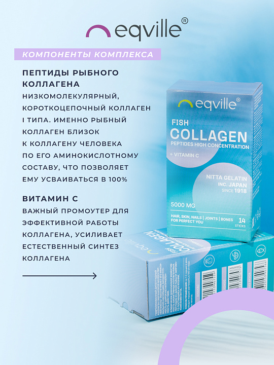 В комплексе используется пептидный короткоцепочный коллаген с клинически доказанной эффективностью: рыбный коллаген обладает сверхнизкой молекулярной массой, что позволяет ему усваиваться в 1,5 раза лучше по сравнению с аналогичными пептидными коллагенами иного происхождения.