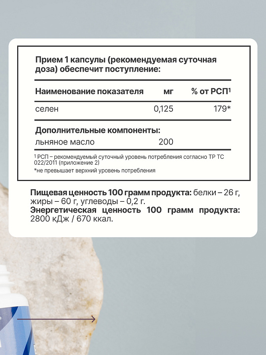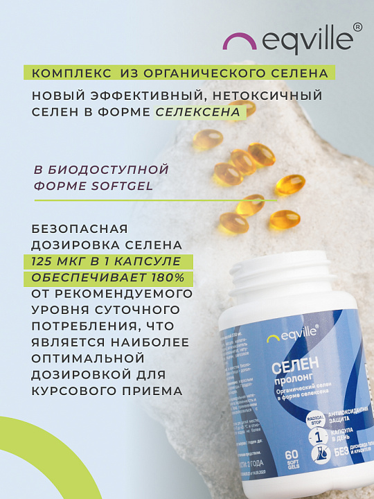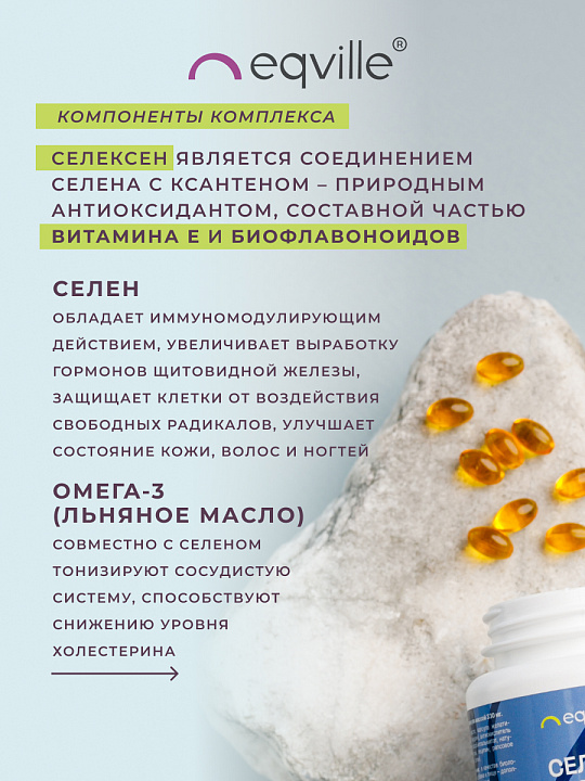 В комплексе жирорастворимый селексен работает совместно с Омега-3 из высокоочищенного льняного масла, источника альфа-линоленовой кислоты. Льняное масло совместно с селеном тонизируют сосудистую систему, способствуют снижению уровня холестерина.