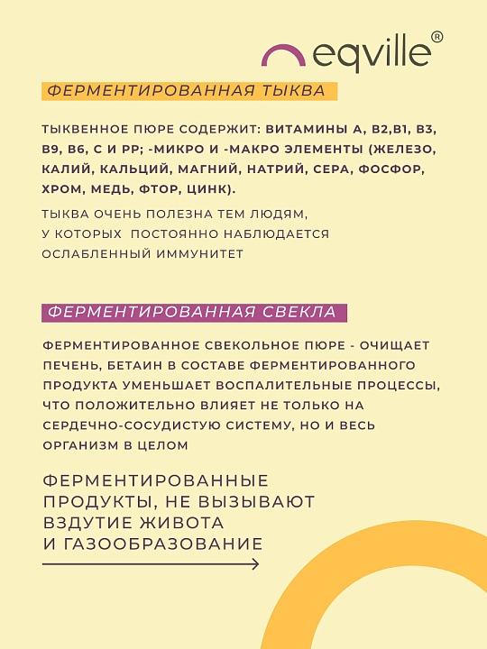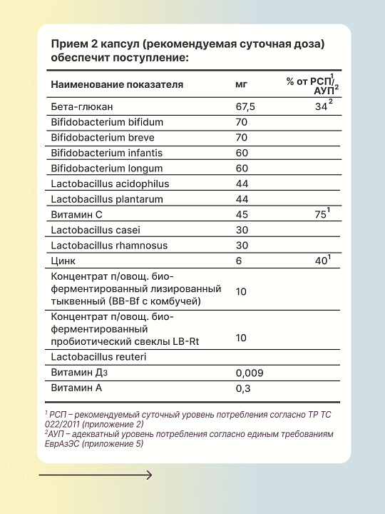 В состав комплекса включены ферментированные овощные пюре тыквы и свеклы — биологически преобразованное пробиотиками растительное сырье, источник натуральных витаминов, минералов, клетчатки, аминокислот, обогащенных полезными метаболитами бактерий.