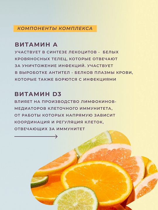 В состав комплекса входят микроэлементы входящие в обязательный протокол лечения вирусных и бактериальных заболеваний, такие как – цинк, витамины А, С, D3.