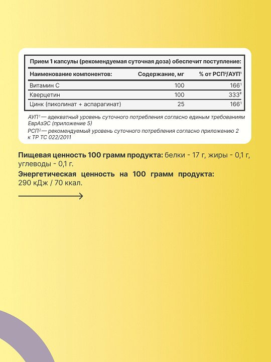 Состав: витамин С (L-натрия аскорбат), кверцетина дигидрат, капсула желатиновая (желатин, глицерин (агент влагоудерживающий)), цинка пиколинат, цинка аспарагинат, целлюлоза микрокристаллическая (носитель), кальциевая соль стеариновой кислоты (агент антислеживающий), кремния диоксид (агент антислеживающий)