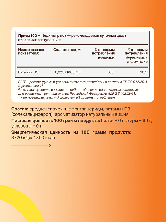 форма спрея, которая позволяет удобно дозировать продукт в зависимости от потребности организма по результатам анализа о дефиците витамина. D3 является одним из самых важных витаминов для здоровья человека, однако стоит знать, что передозировка может привести к неправильному его усвоению, что может привести к кальцификации сосудов.
